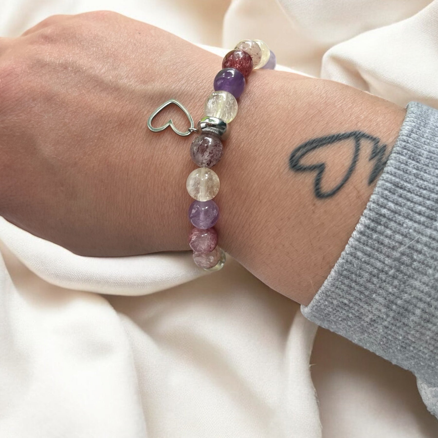 Découvrez notre bracelet ajustable pour femme, conçu avec des perles de cacoxénite de 6 mm et un pendentif en forme de cœur en acier inoxydable. Ce bijou allie élégance et énergie positive, parfait pour les amateurs de pierres semi-précieuses.