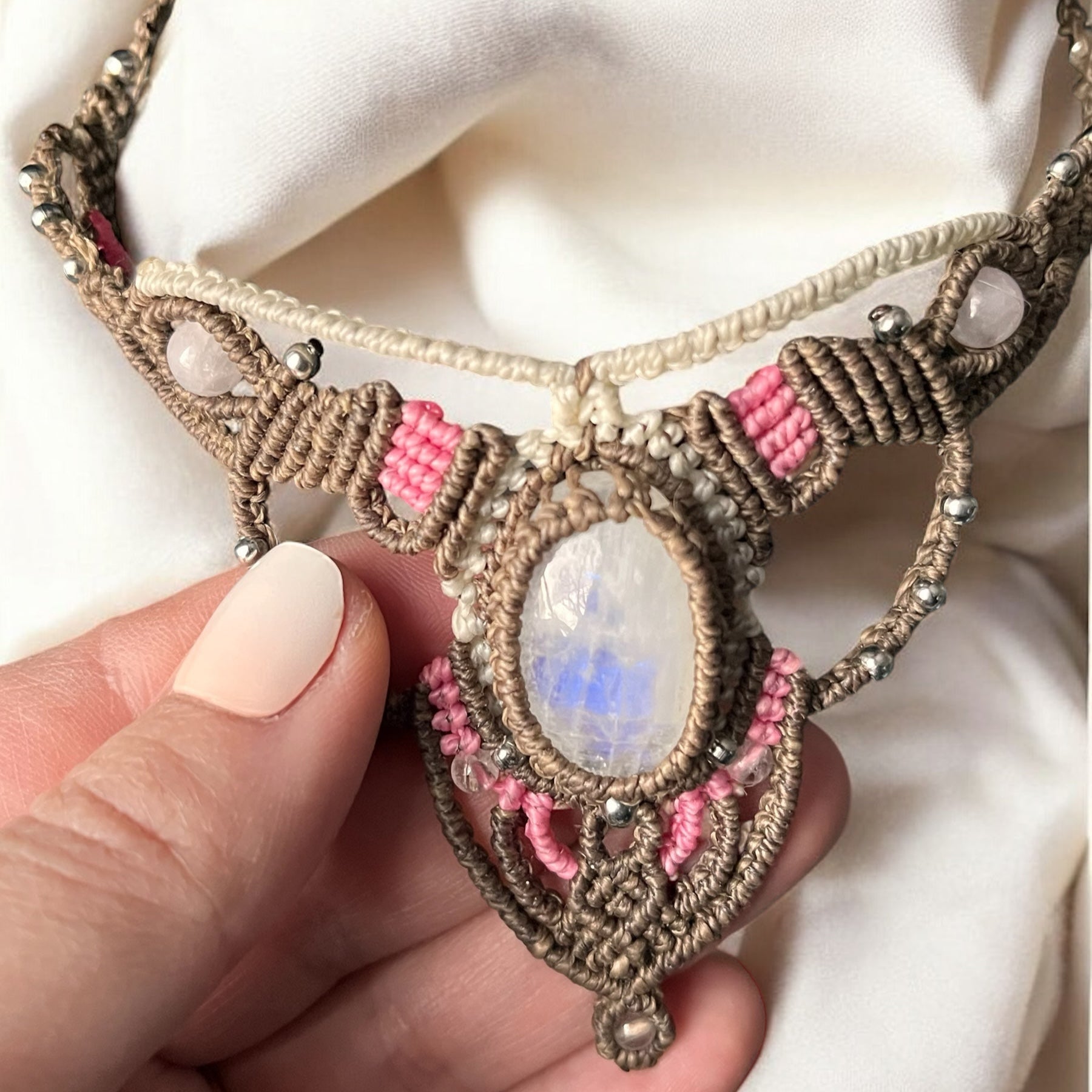 - Matériaux : fil ciré, pierre de lune arc en ciel et de quartz