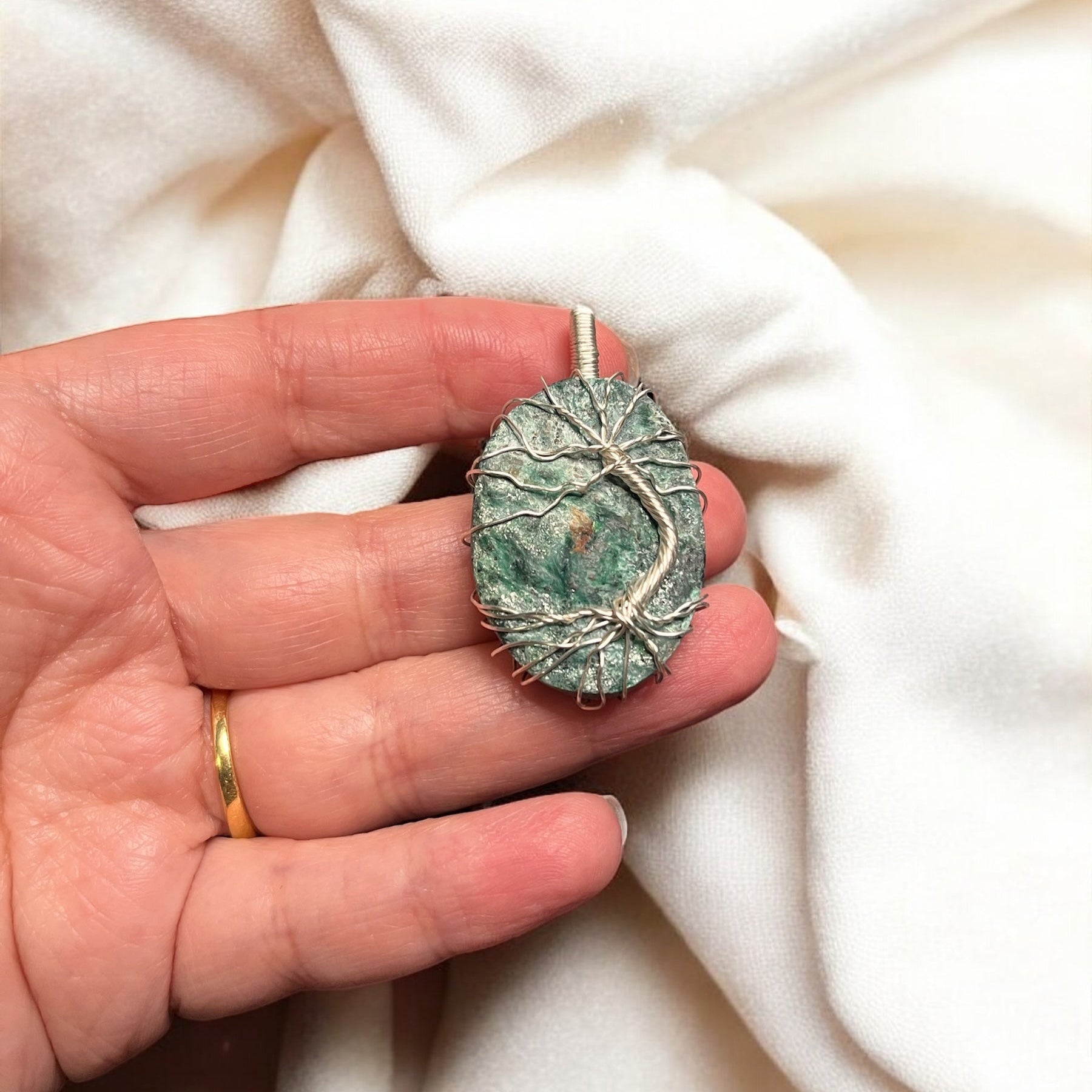 Laissez-vous séduire par ce magnifique pendentif en fuschite , une pierre aux reflets verts apaisants, sublimée par un arbre de vie entièrement façonné à la main en fil d'aluminium argenté. Ce bijou unique allie élégance et symbolisme naturel puissant, faisant de lui un véritable talisman de bien-être et d'ancrage.