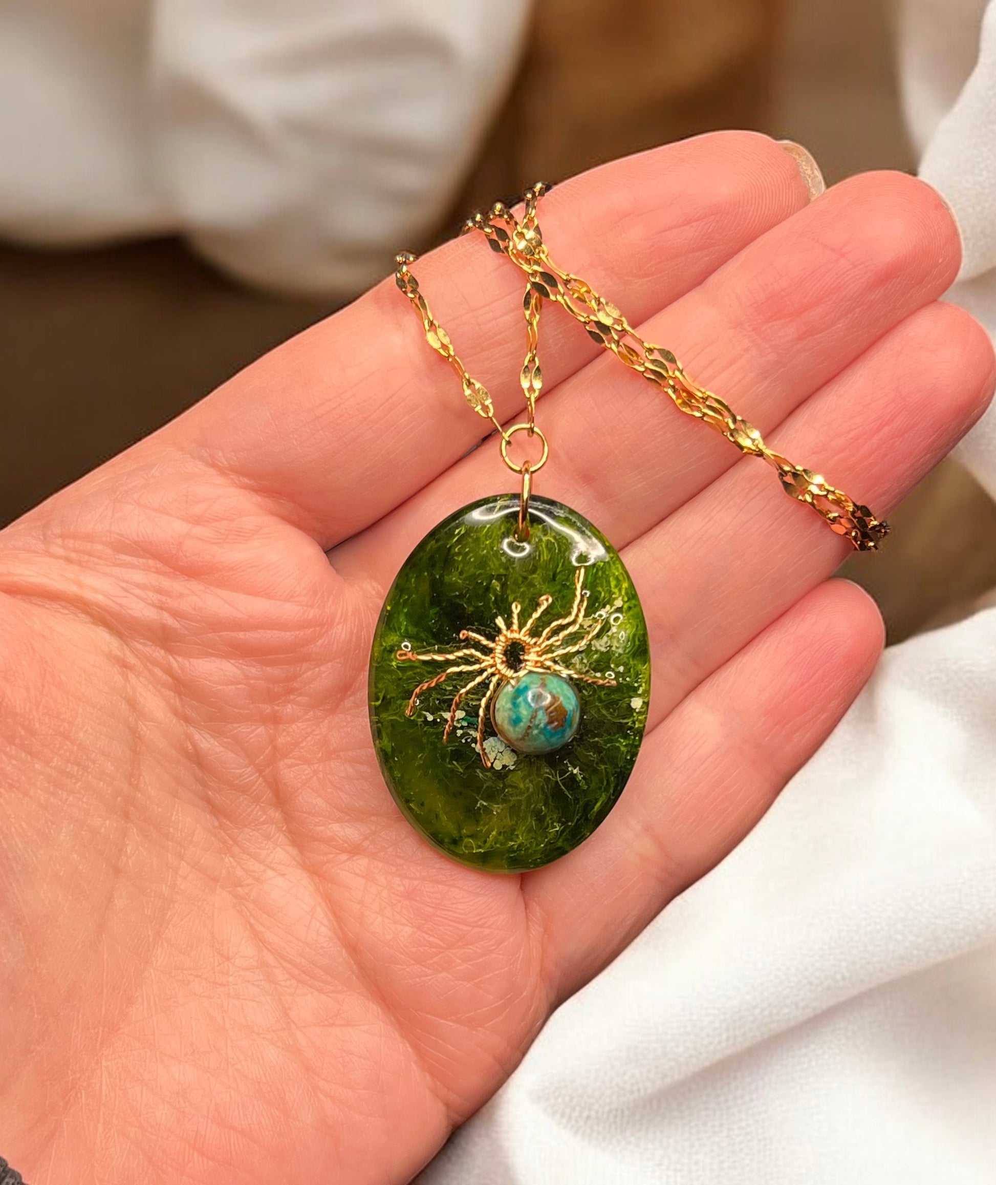 Plongez dans l'univers du mystère et de la nature avec ce collier en acier inox doré réglable de 41 cm à 46 cm grâce à sa rallonge de chaîne. Son pendentif ovale en résine (environ 25 x 35 mm) arbore un somptueux effet encre vert foncé et clair , évoquant les profondeurs de la nature. Une araignée façonnée à la main en fil d'aluminium s'y pose délicatement, avec en son centre une magnifique perle de chrysocolle , pierre de sérénité et d'harmonie.